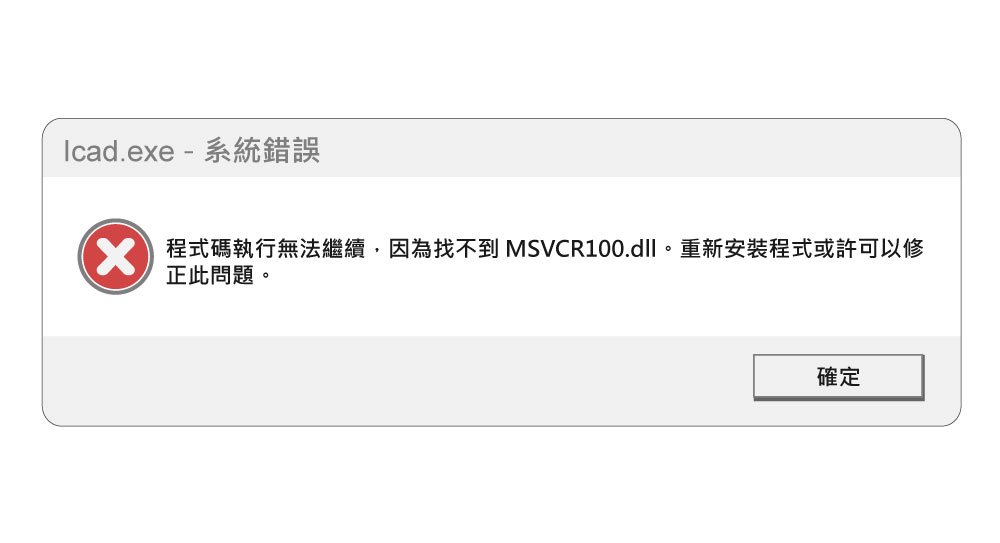 | 程式碼執行無法繼續,因為找不到 MSVCR100.dll。重新安裝程式或許可以修 正此問題。 | ![]() | 因為您的電腦的 Visual C++可能未安裝或版本過舊,可以從微軟官方網站重新下載Visual Studio 2010 (VC++ 10.0) SP1 vcredist_x86.exe 與 vcredist_x64.exe 並安裝,軟體即可正常使用。(2個都需要安裝) vcredist_x86.exe vcredist_x64.exe |